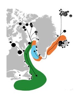 This map shows breeding colonies, migration routes and main wintering areas in the northwest Atlantic. Black dots show the colonies, and the lines and arrows show the routes they take in the fall. The green shows the wintering area mostly used by birds from colonies in Canada and northwest Greenland. The two orange areas are mostly used by birds from Svalbard and Iceland, and the blue area is mostly used by birds from southwest Greenland. Because of the mixing of birds from different breeding colonies in their winter range, both environmental conditions and human activities in winter affect breeding colonies in several countries.